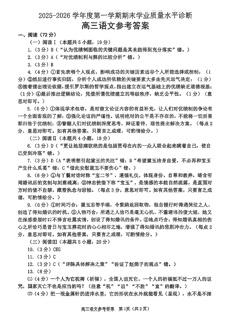 高三语文答案--东省烟台市2026届高三第一学期1月期末学业质量水平诊断