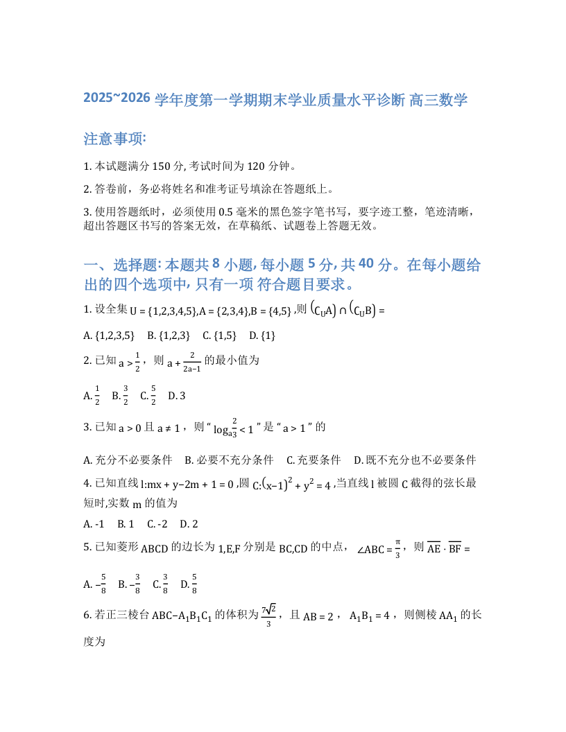 高三数学+答案--东省烟台市2026届高三第一学期1月期末学业质量水平诊断