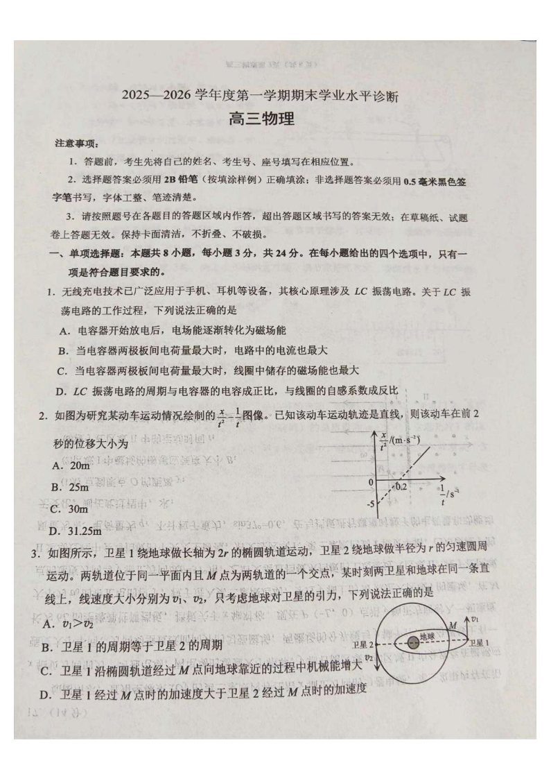 高三物理--东省烟台市2026届高三第一学期1月期末学业质量水平诊断