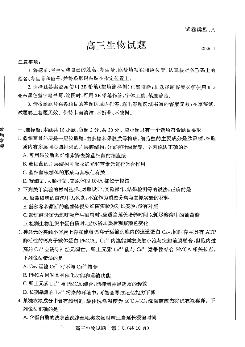 高三生物--山东省滨州市2026届高三上学期1月期末考试