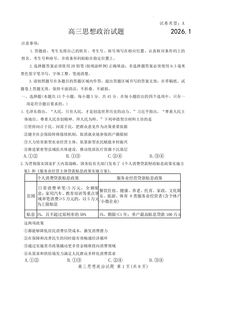 高三政治--山东省滨州市2026届高三上学期1月期末考试
