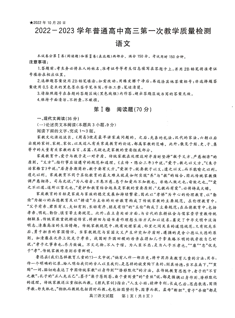 高三语文--河南省信阳市普通高中2022-2023学年高三第一次教学质量检测
