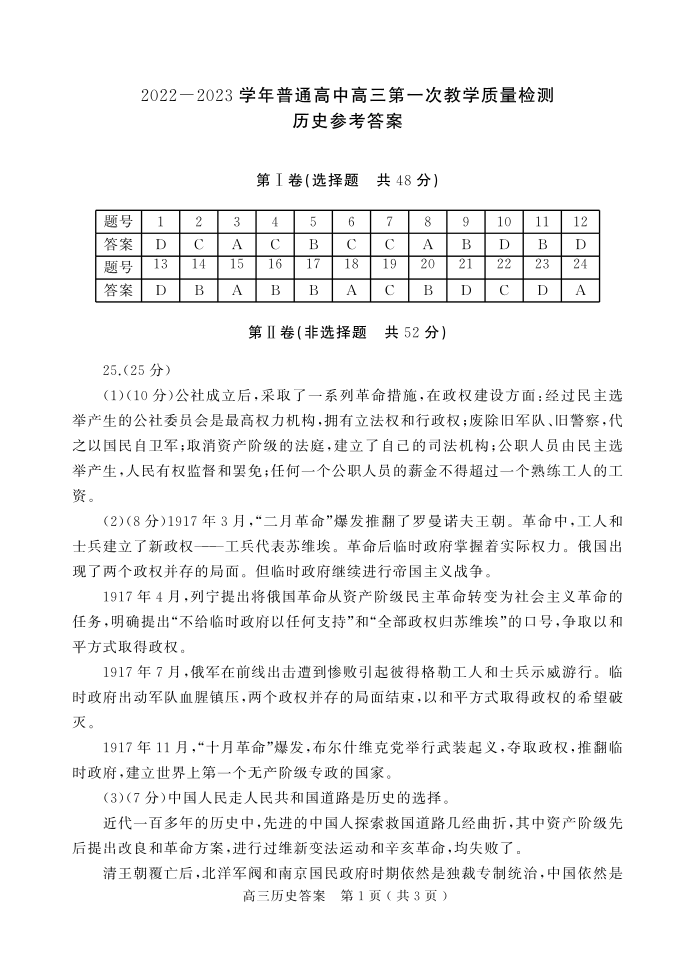 高三历史答案--河南省信阳市普通高中2022-2023学年高三第一次教学质量检测