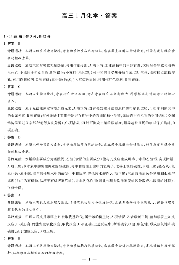 高三化学答案--安徽省多校大联考2025-2026学年高三上学期1月月考
