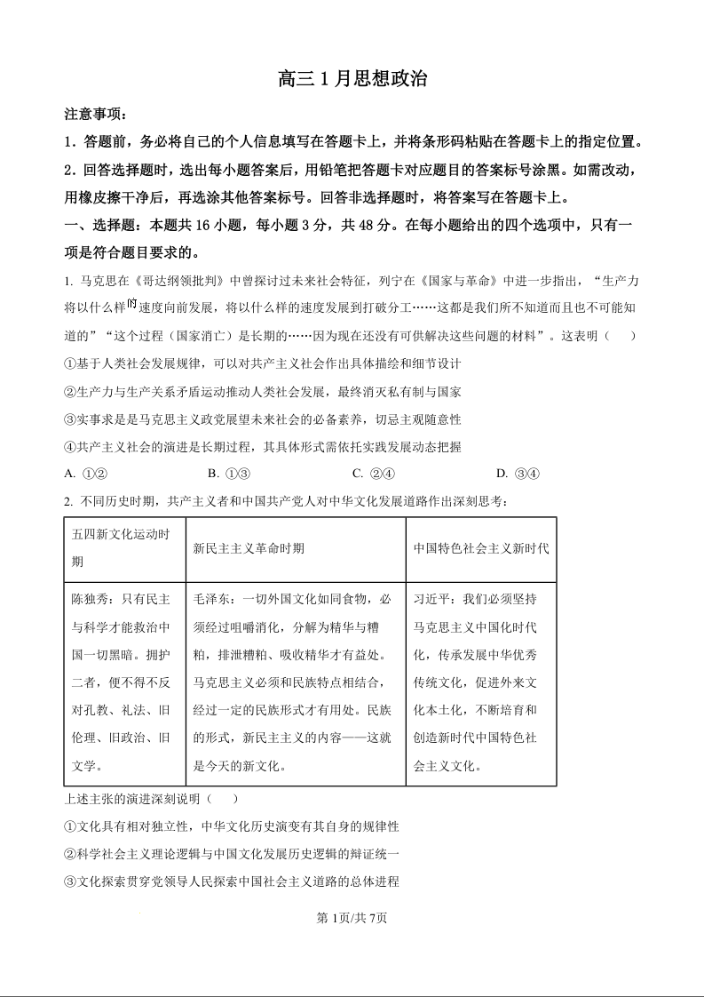 高三政治(原卷版)--安徽省多校大联考2025-2026学年高三上学期1月月考