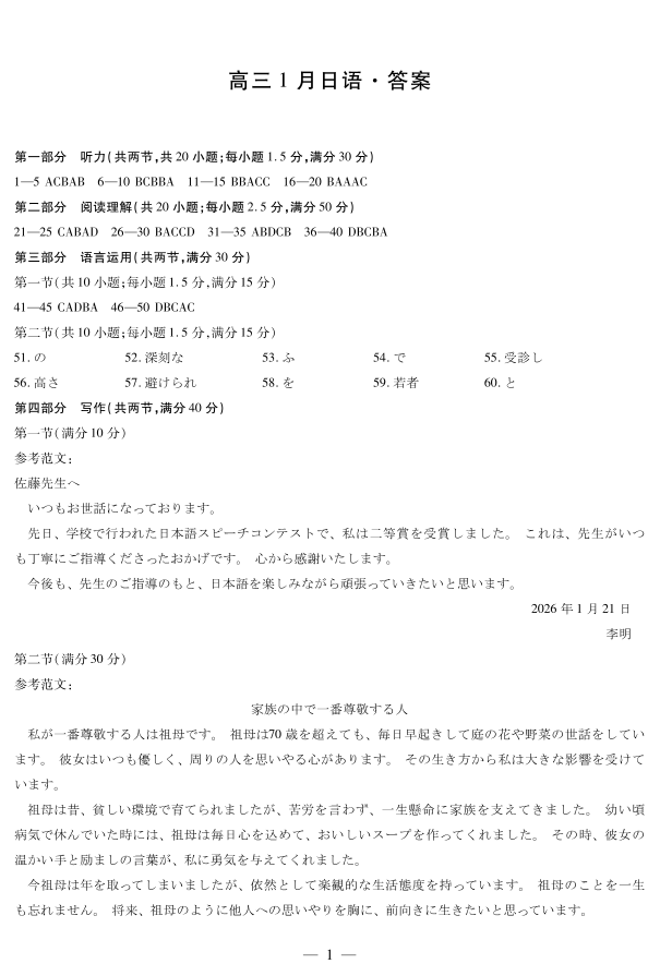 高三日语答案--安徽省多校大联考2025-2026学年高三上学期1月月考