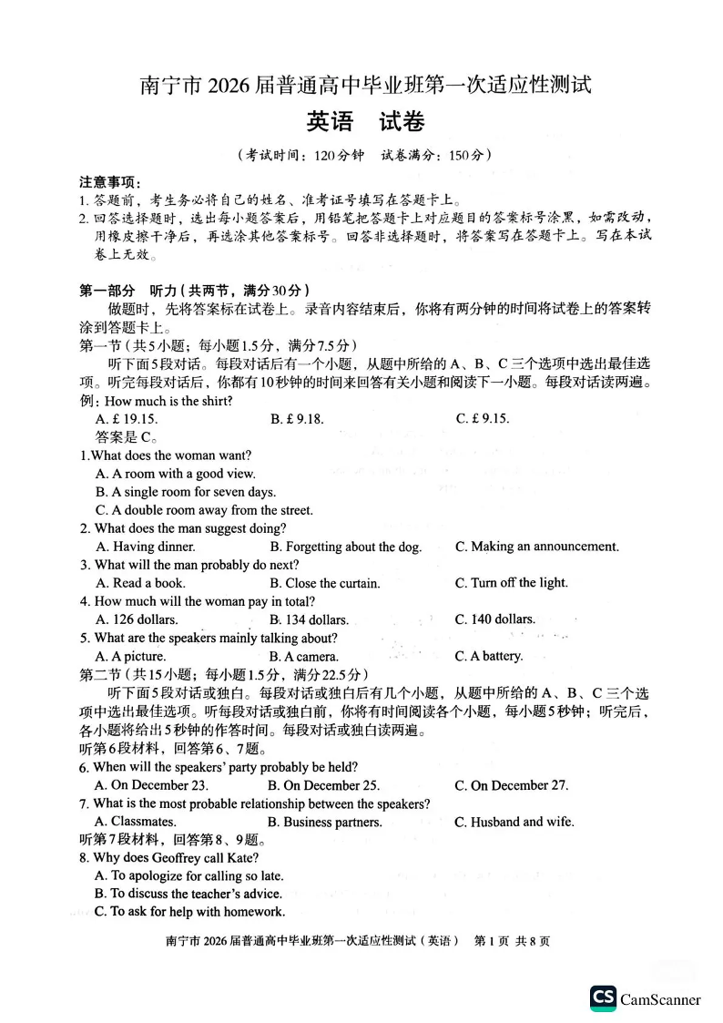 高三英语--广西南宁市2026届普通高中毕业班第一次适应性测试(南宁一模)