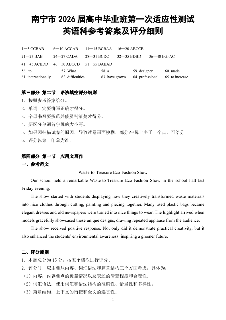 高三英语答案--广西南宁市2026届普通高中毕业班第一次适应性测试(南宁一模)