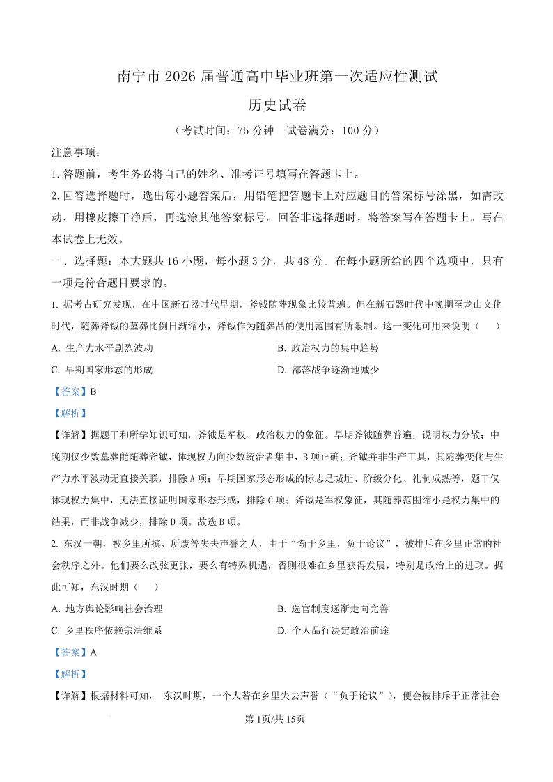 高三历史答案--广西南宁市2026届普通高中毕业班第一次适应性测试(南宁一模)