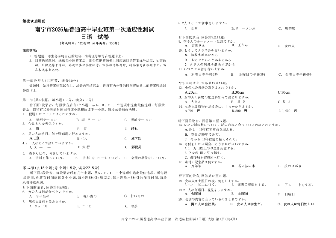 高三日语+答案--广西南宁市2026届普通高中毕业班第一次适应性测试(南宁一模)