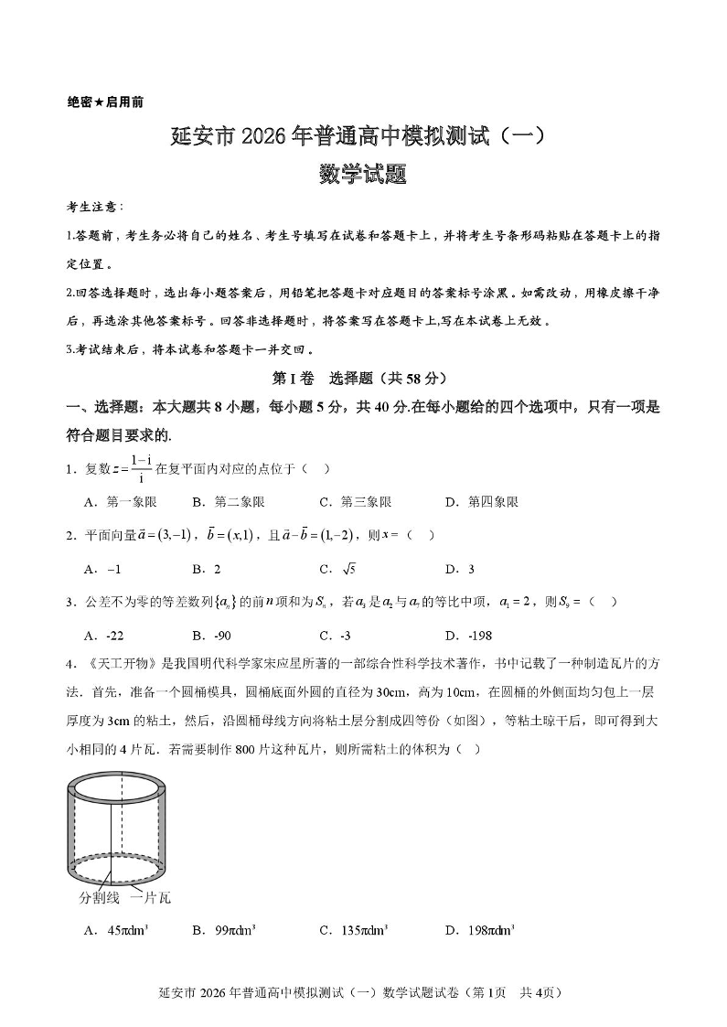 高三数学+答案--陕西省延安市2026届高三上学期普通高中模拟测试(一)