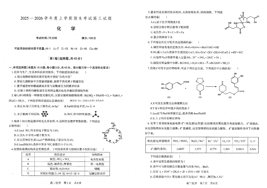 高三化学--辽宁省辽南协作校2026届高三1月期末考试