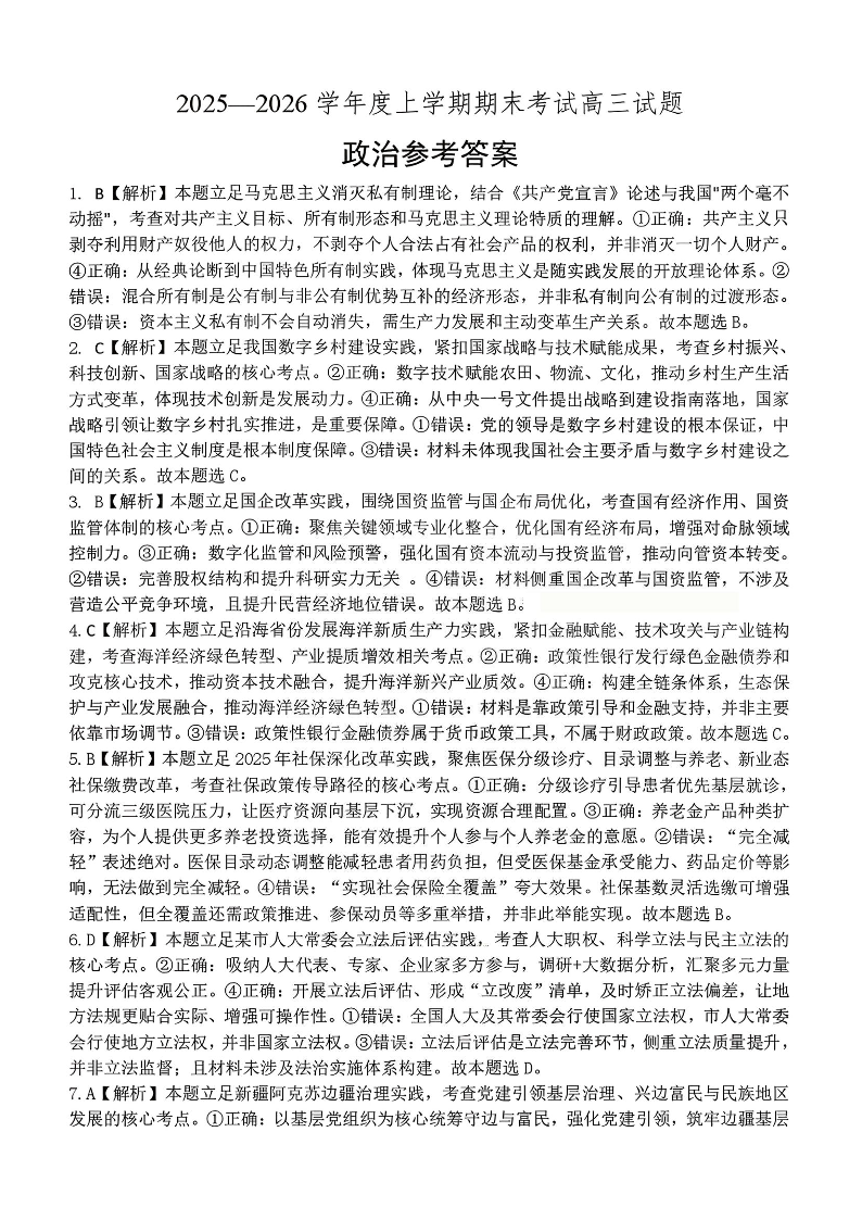 高三政治答案--辽宁省辽南协作校2026届高三1月期末考试