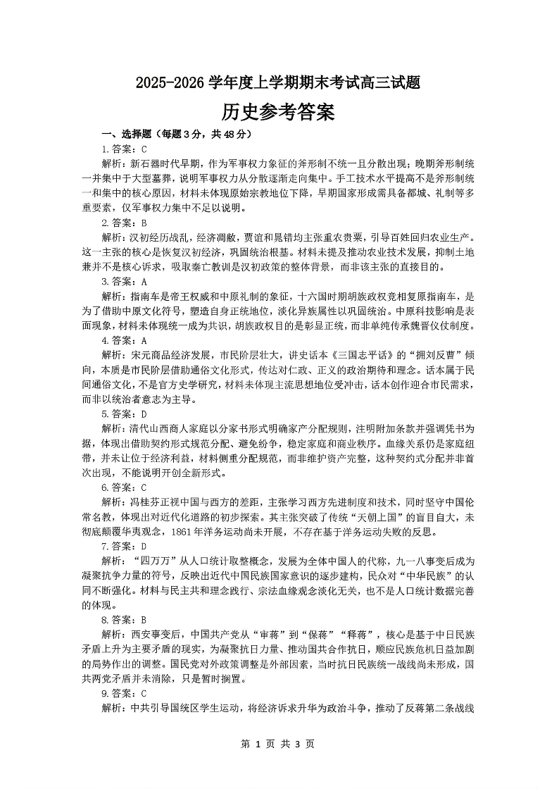 高三历史答案--辽宁省辽南协作校2026届高三1月期末考试