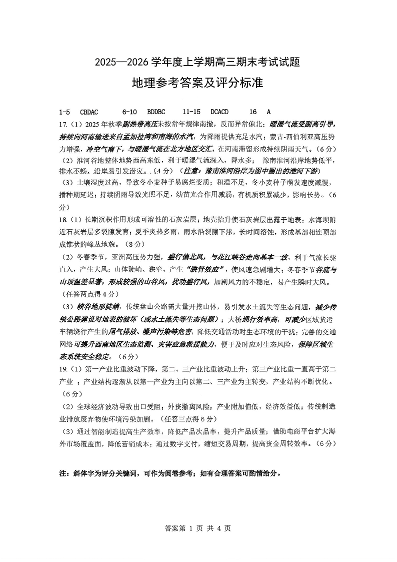 高三地理答案--辽宁省辽南协作校2026届高三1月期末考试