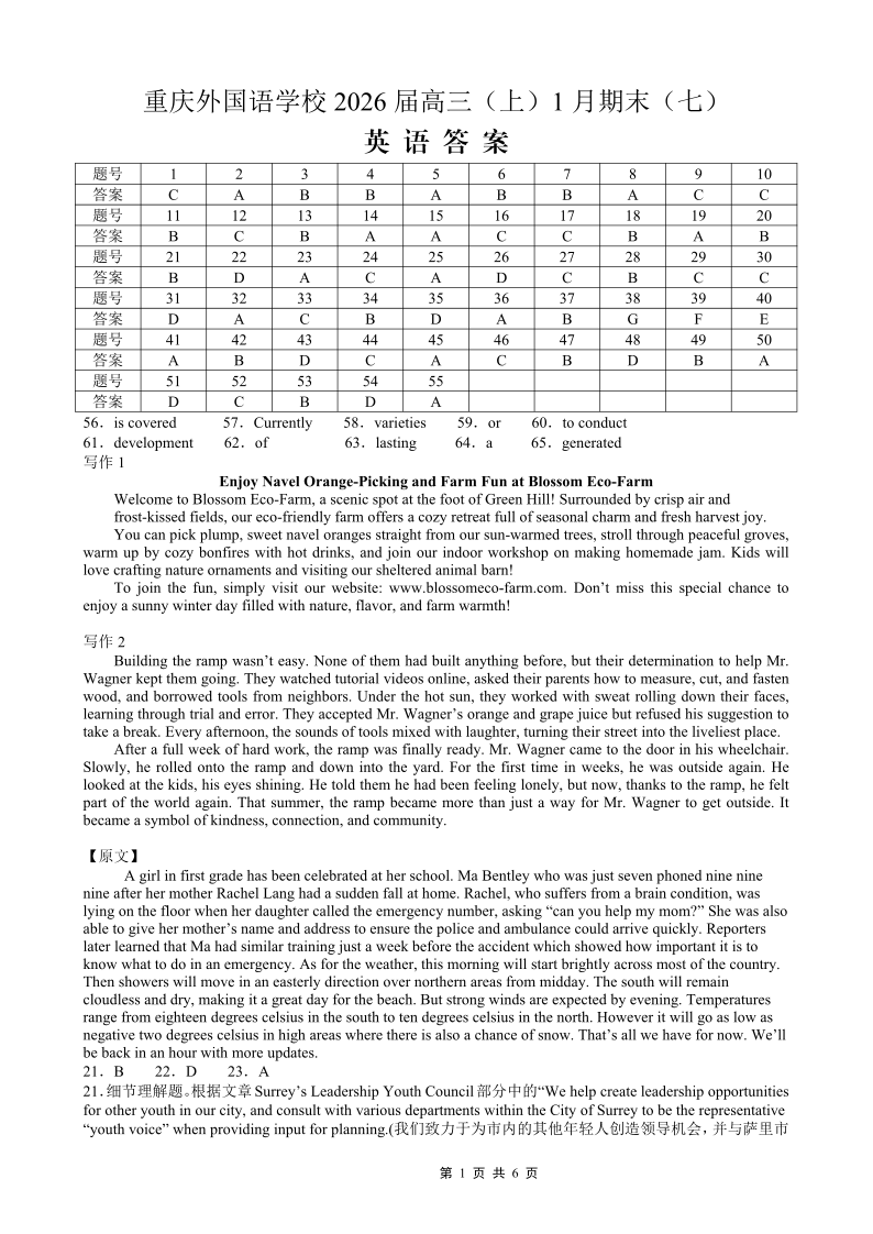 高三英语答案--重庆实验外国语学校2026届高三1月期末考试(七)