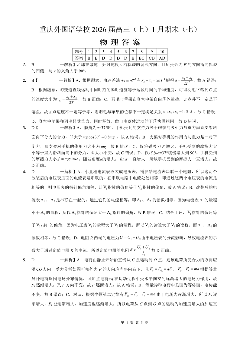 高三物理答案--重庆实验外国语学校2026届高三1月期末考试(七)