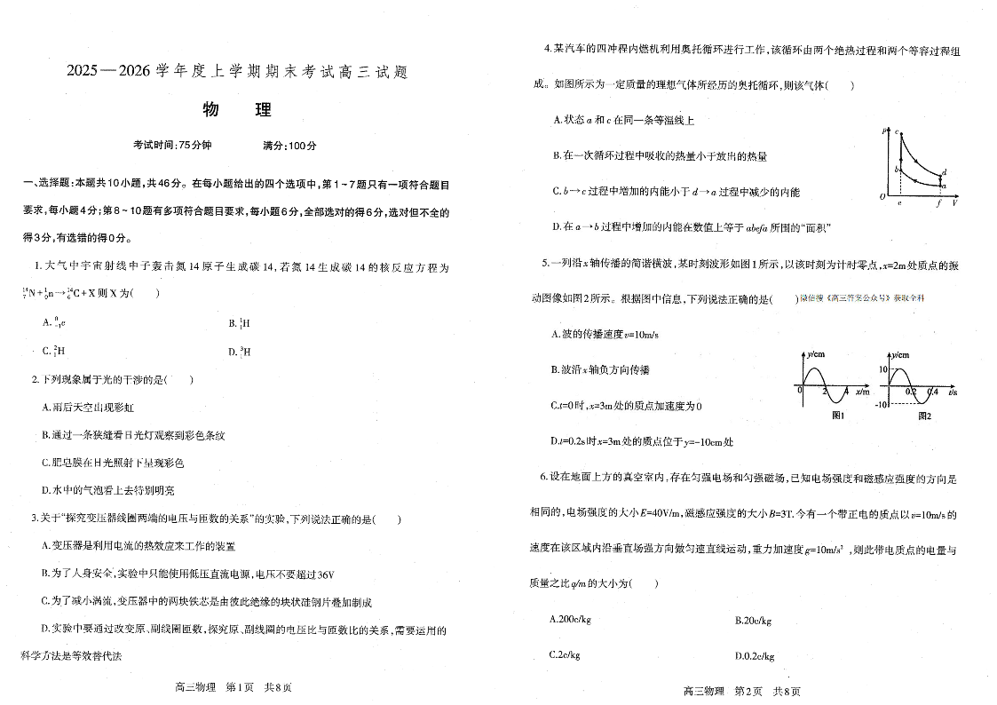 高三物理--辽宁协作校2026届高三上学期1月期末考试