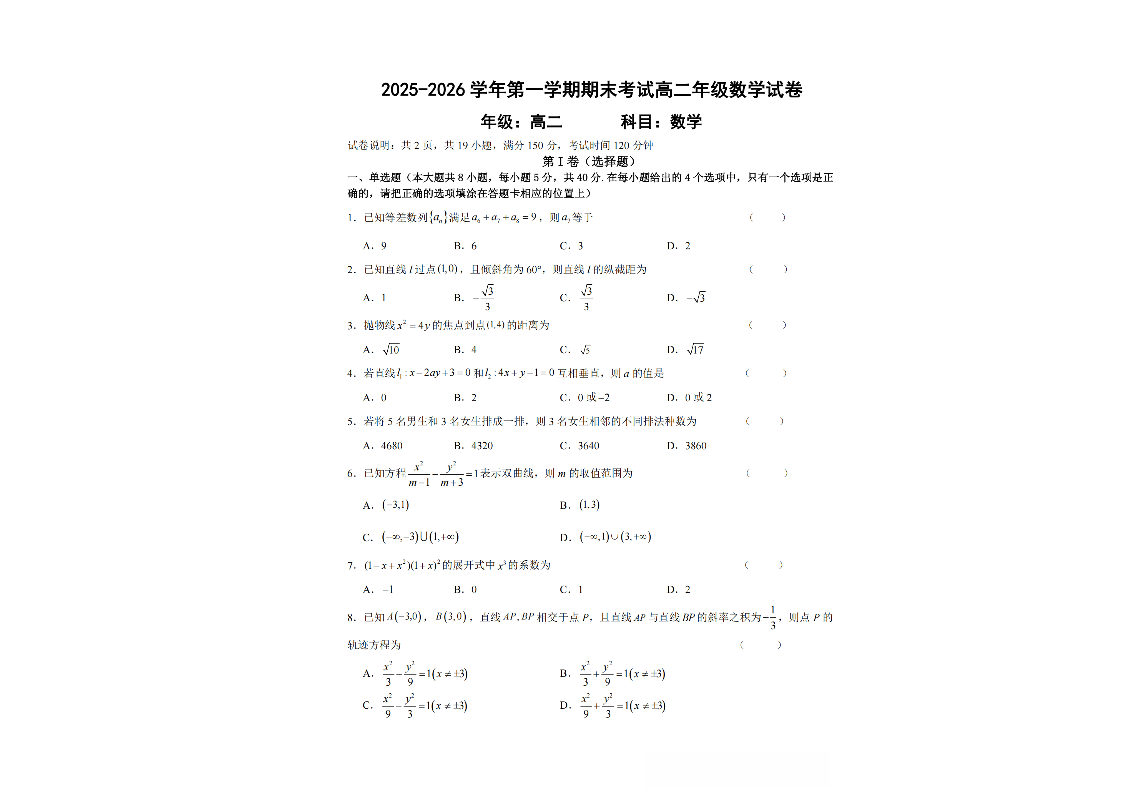 高二数学+答案--甘肃省兰州市八校联考2025-2026学年高二上学期期末考试
