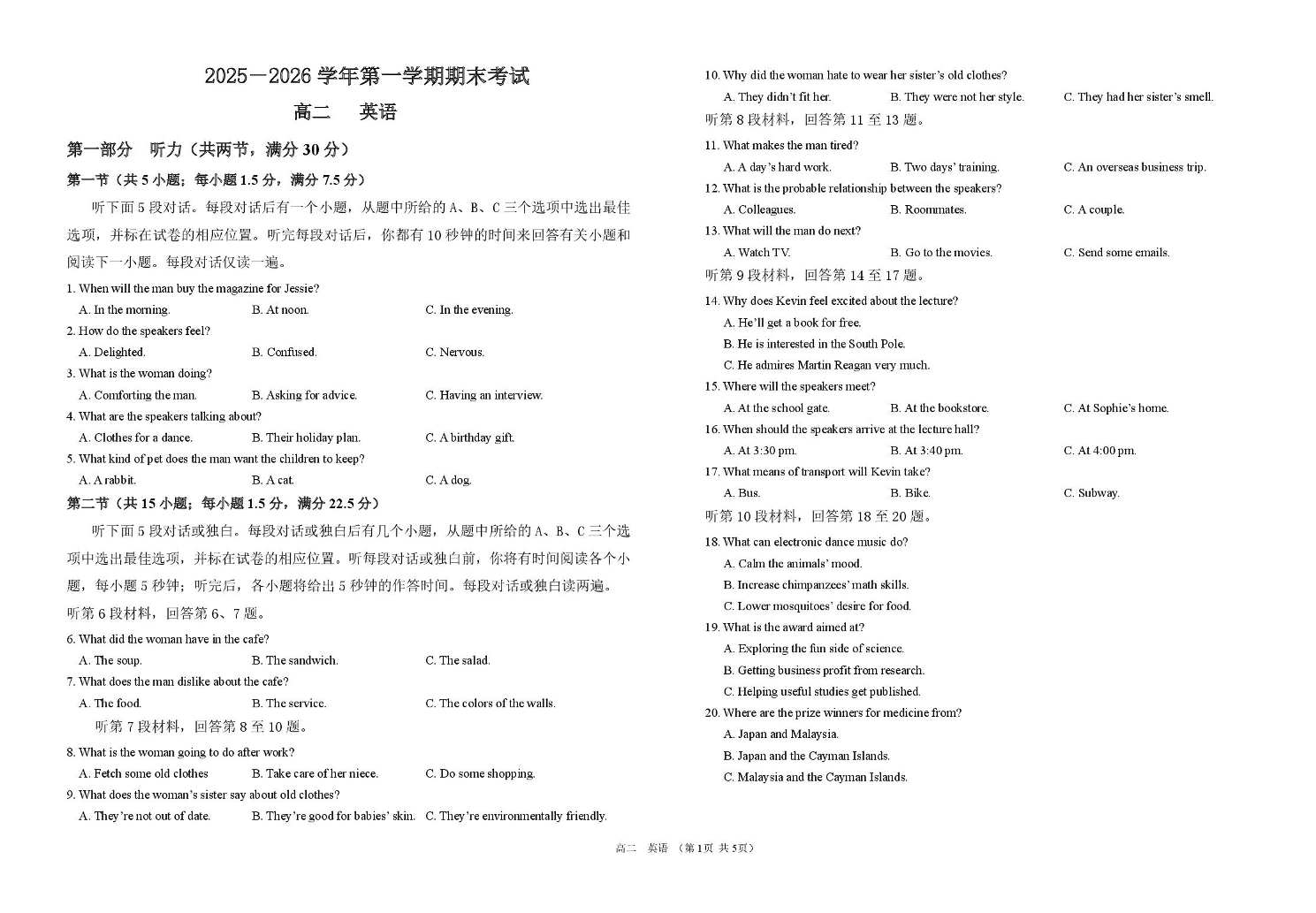 高二英语+答案--甘肃省兰州市八校联考2025-2026学年高二上学期期末考试