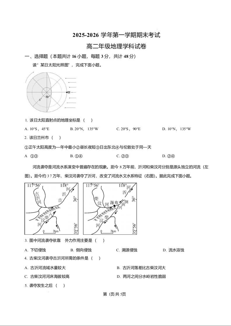 高二地理+答案--甘肃省兰州市八校联考2025-2026学年高二上学期期末考试