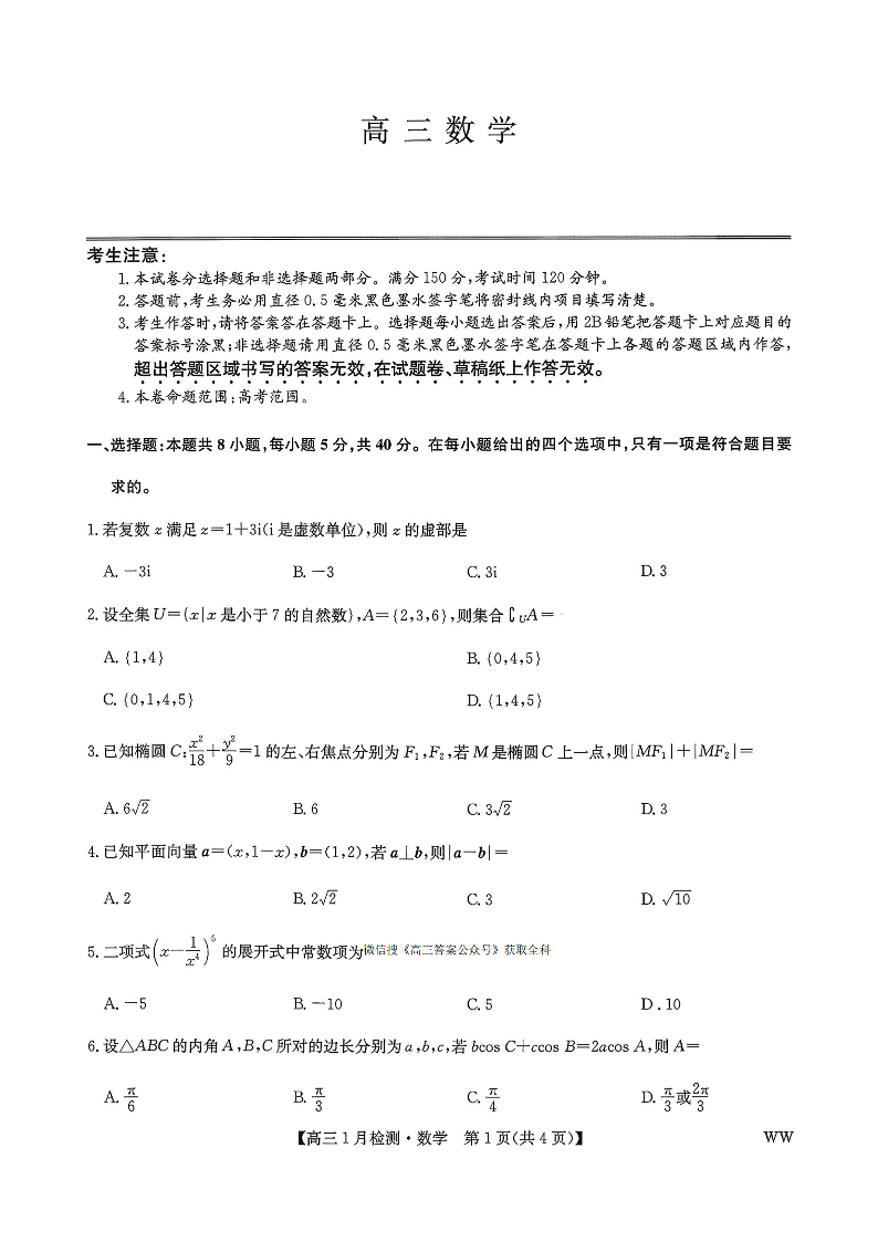 高三数学+答案--九师联盟2026届高三1月质量检测