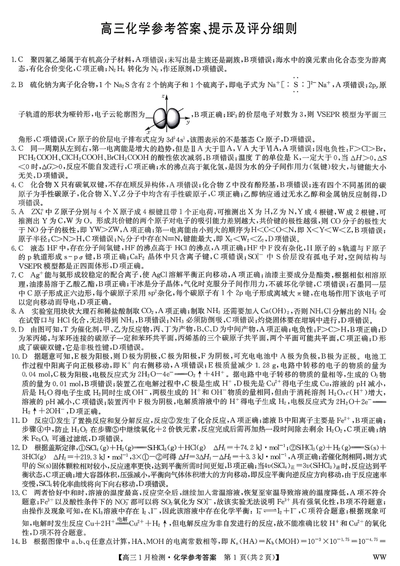 高三化学答案--九师联盟2026届高三1月质量检测