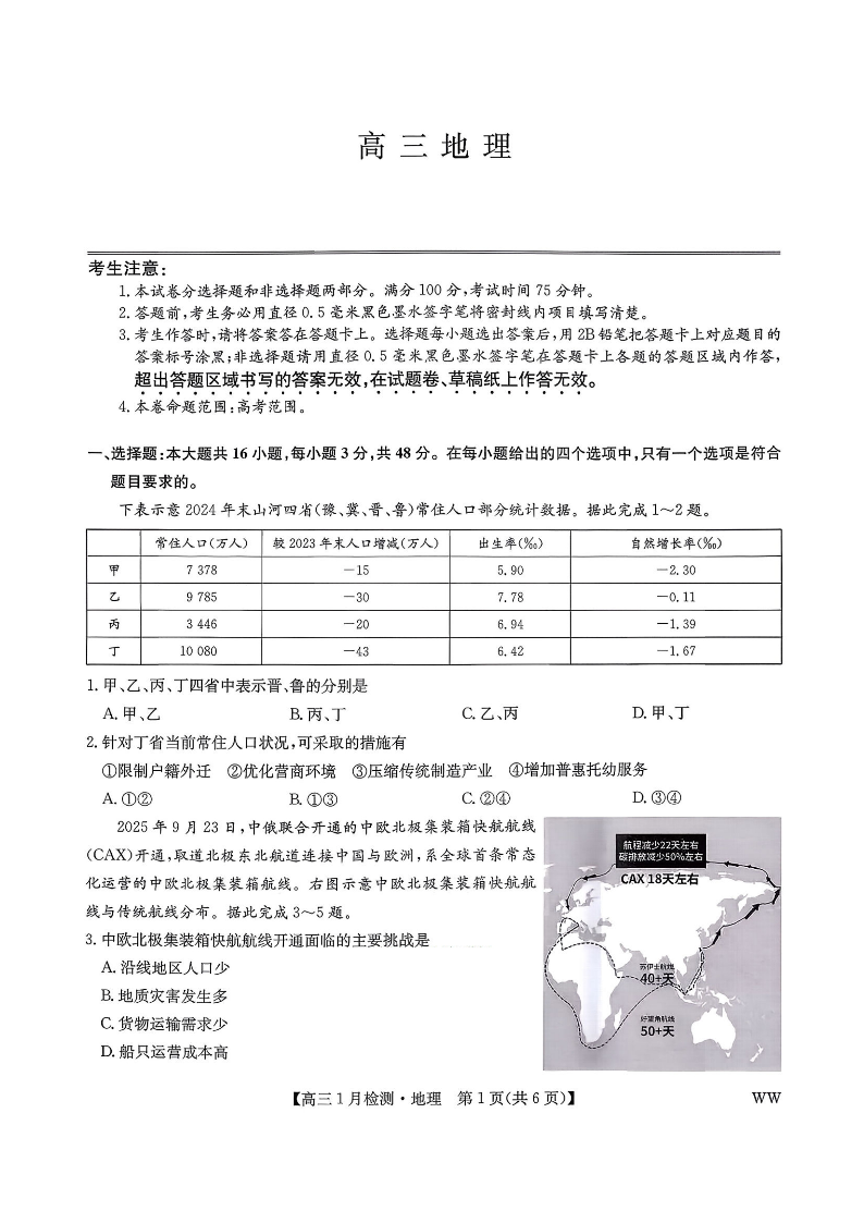高三地理--九师联盟2026届高三1月质量检测