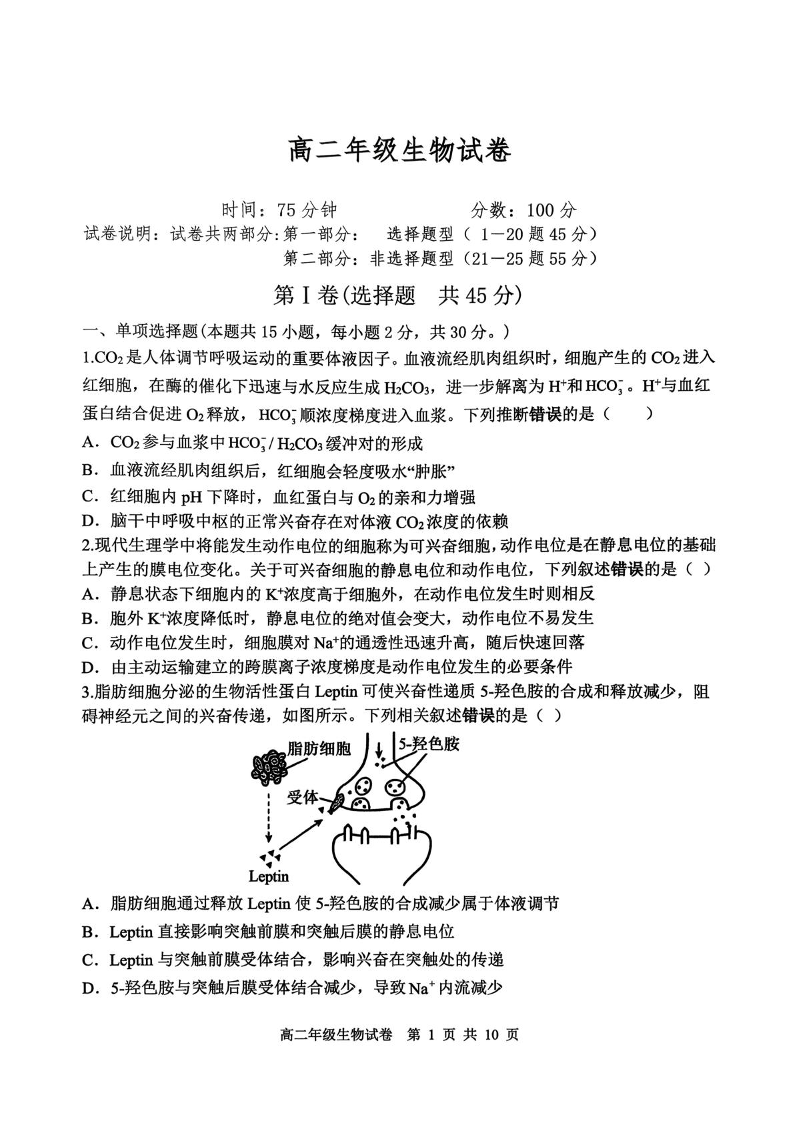高二生物--辽宁省沈阳市五校协作体2025-2026学年高二上学期1月期末考试