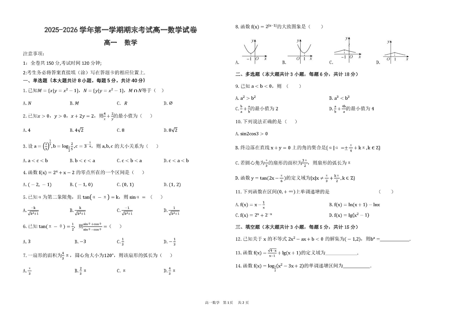 高一数学+答案--甘肃省兰州市八校联考2025-2026学年高一上学期期末考试