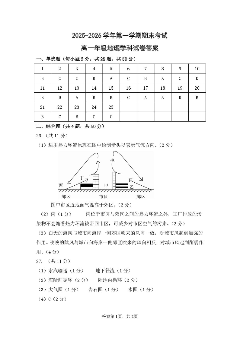 高一地理答案--甘肃省兰州市八校联考2025-2026学年高一上学期期末考试