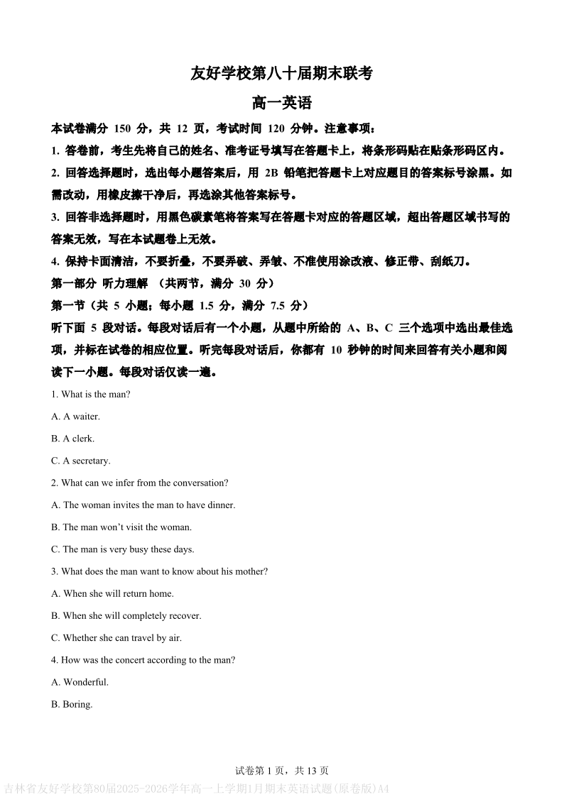 高一英语(原卷版)--吉林省普通高中友好学校联合体2025-2026学年高一上学期期末联考