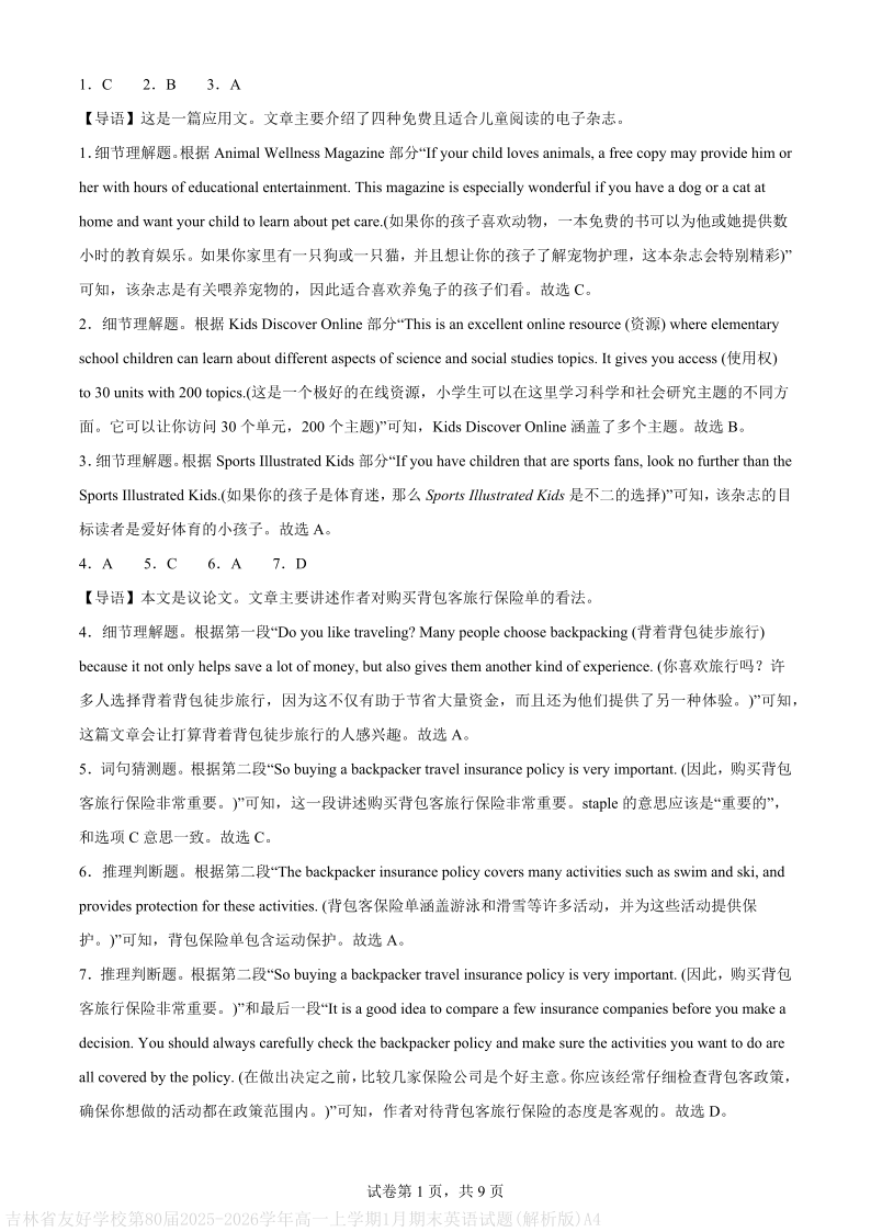 高一英语(解析版)--吉林省普通高中友好学校联合体2025-2026学年高一上学期期末联考