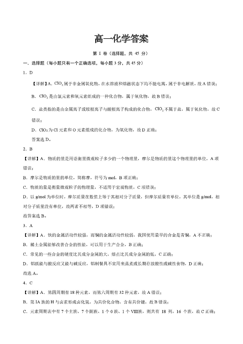 高一化学答案--吉林省普通高中友好学校联合体2025-2026学年高一上学期期末联考