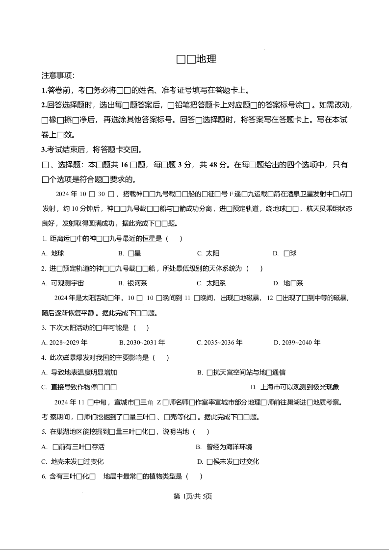 高一地理+答案--吉林省普通高中友好学校联合体2025-2026学年高一上学期期末联考