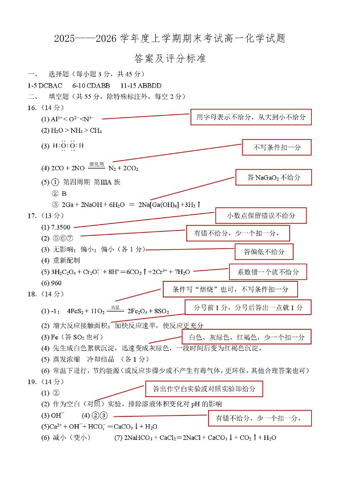 高一化学答案--辽宁省辽南协作体2025-2026学年高一上学期期末