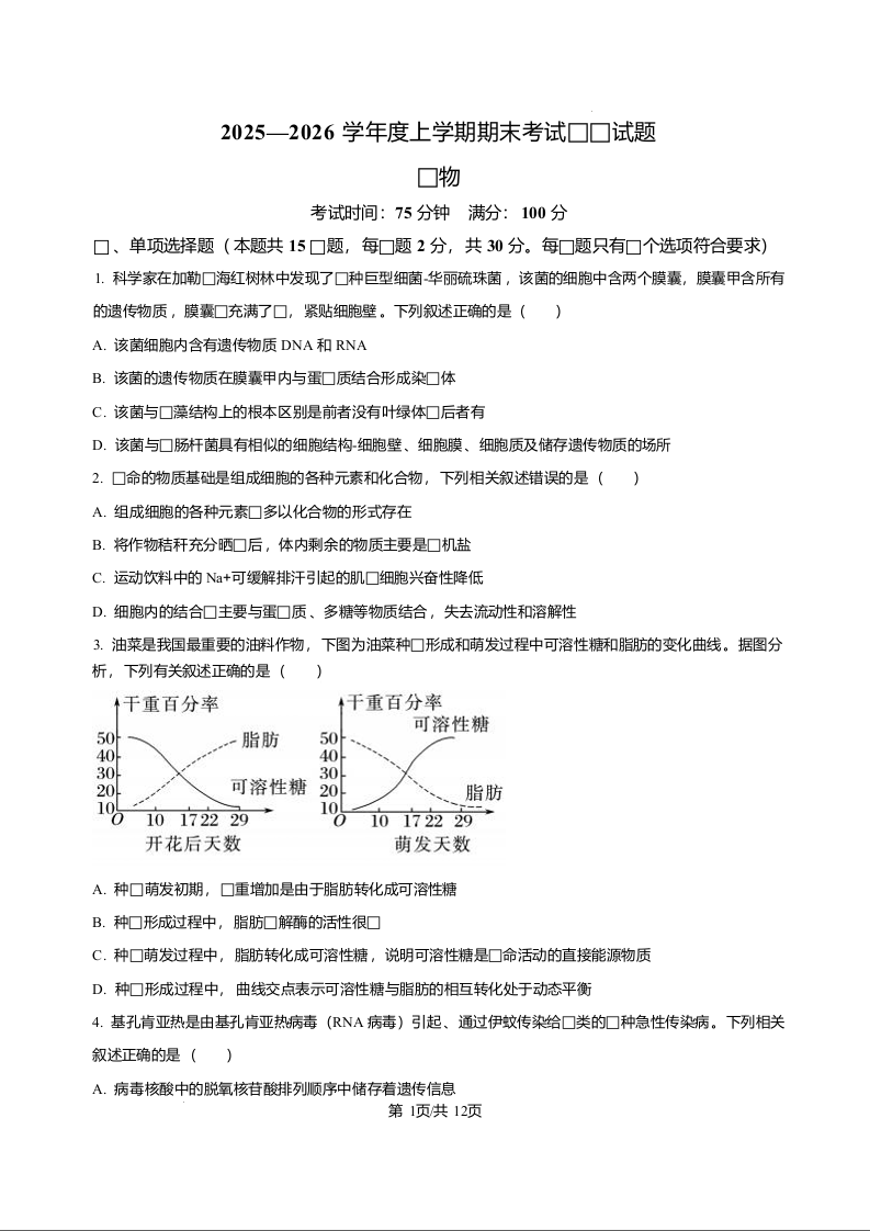 高一生物+答案--辽宁省辽南协作体2025-2026学年高一上学期期末