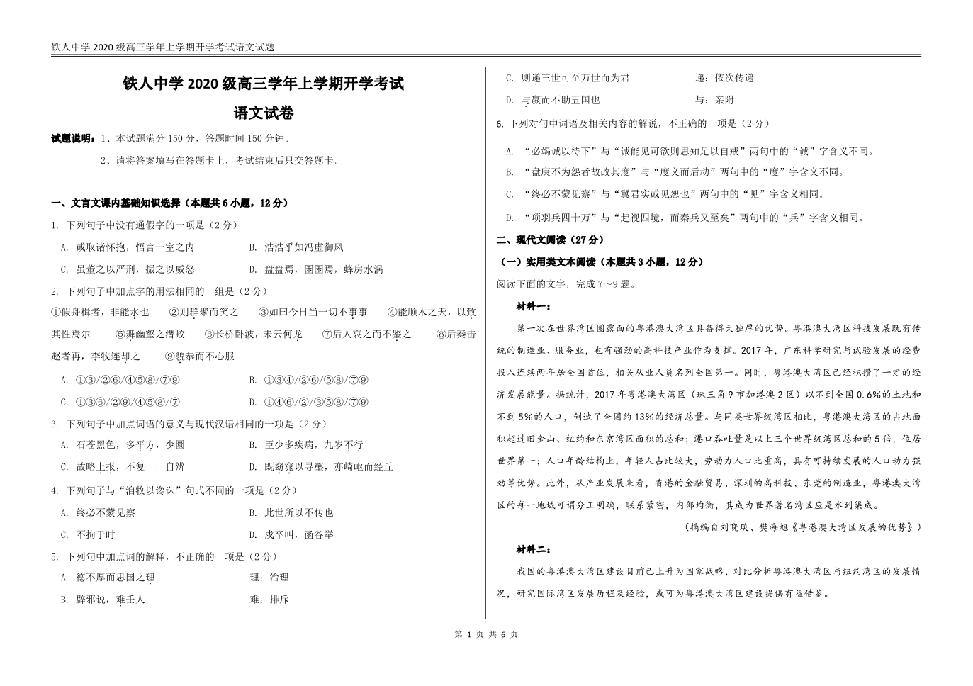 高三语文--黑龙江省大庆铁人中学2023届高三上学期开学考试