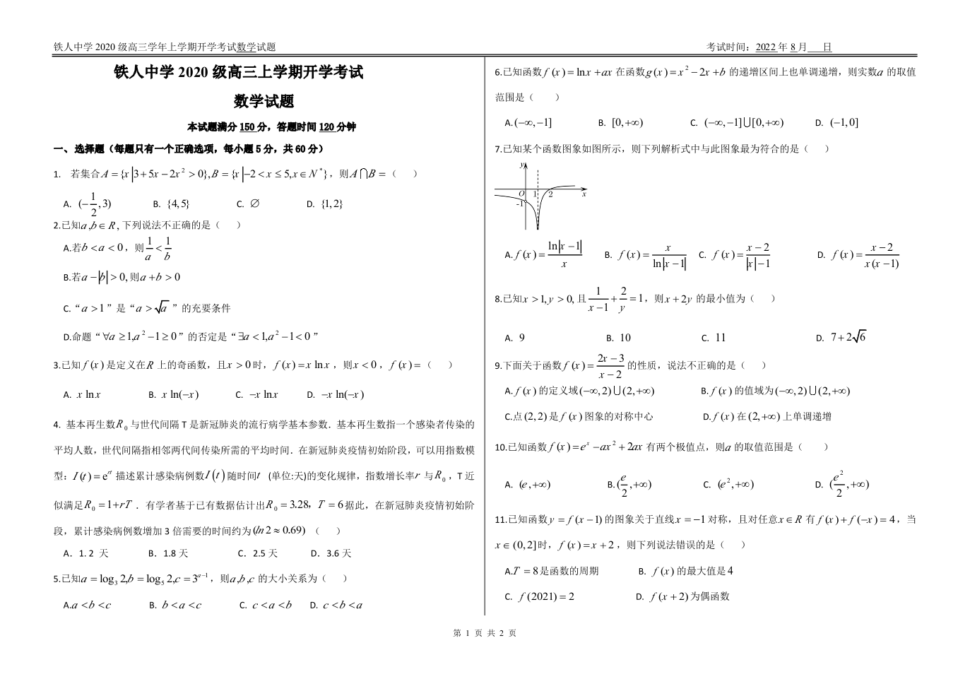 高三数学--黑龙江省大庆铁人中学2023届高三上学期开学考试