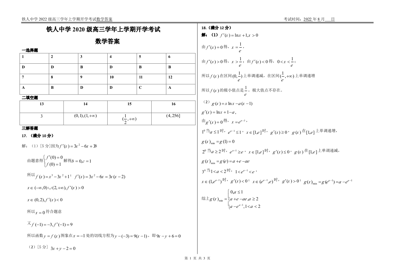 高三数学答案--黑龙江省大庆铁人中学2023届高三上学期开学考试
