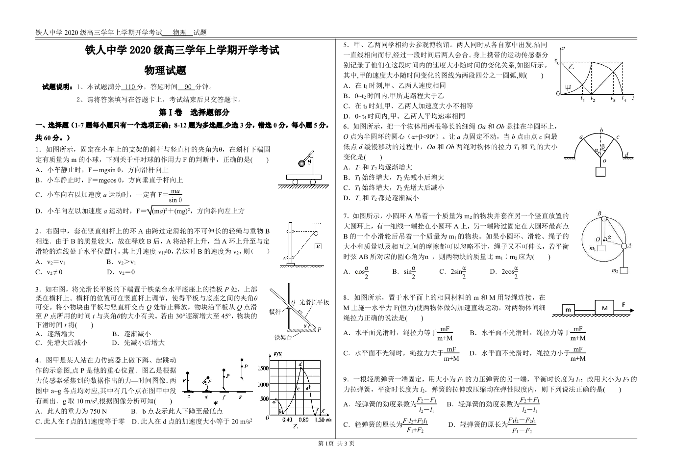 高三物理--黑龙江省大庆铁人中学2023届高三上学期开学考试