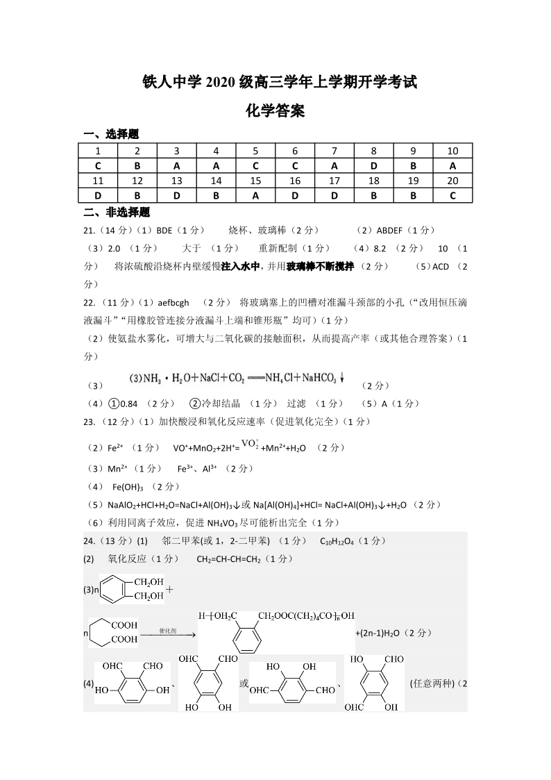 高三化学答案--黑龙江省大庆铁人中学2023届高三上学期开学考试