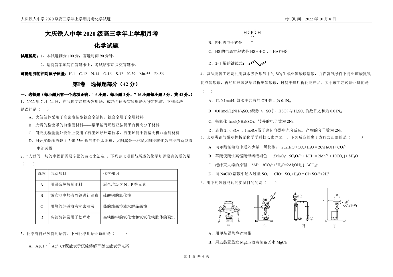 高三化学--黑龙江省大庆铁人中学高三上学期第一次月考