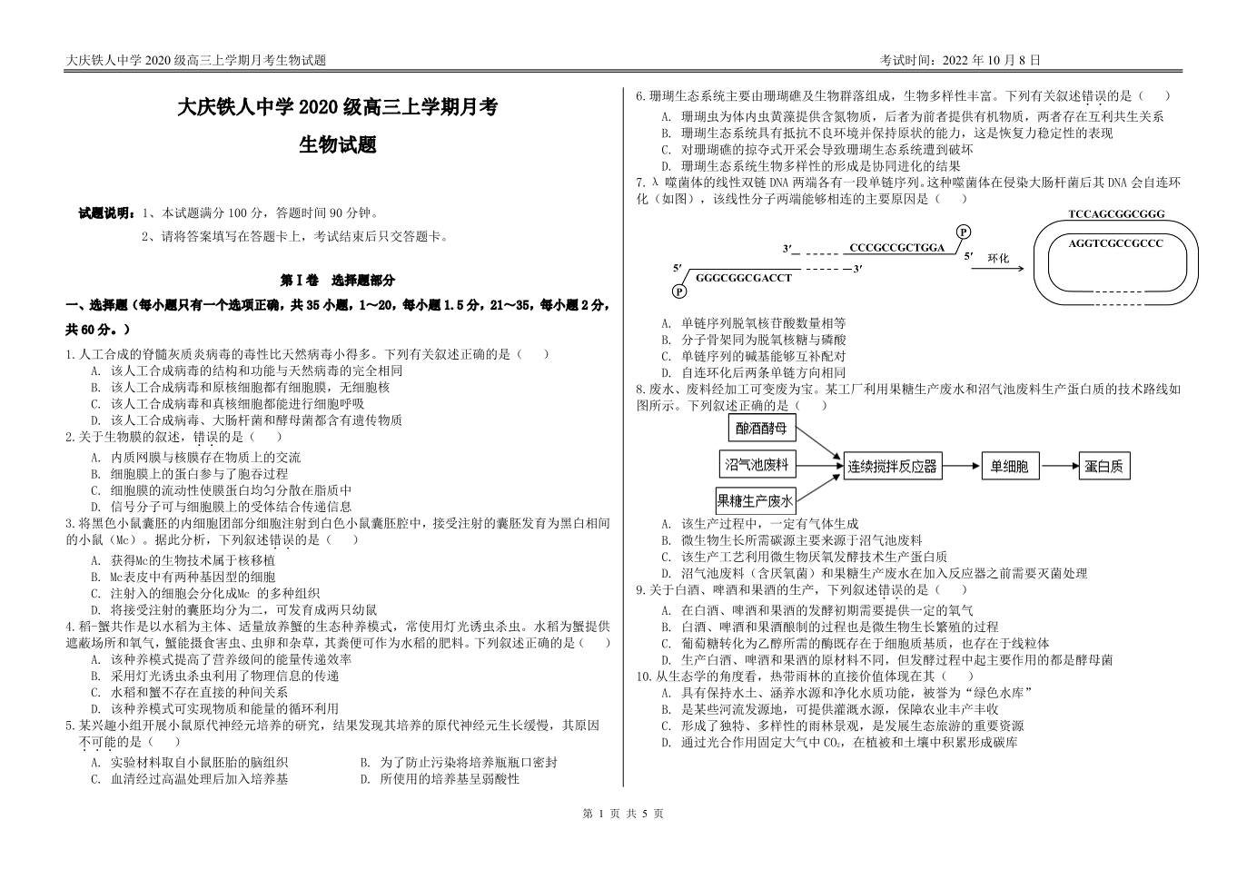 高三生物--黑龙江省大庆铁人中学高三上学期第一次月考