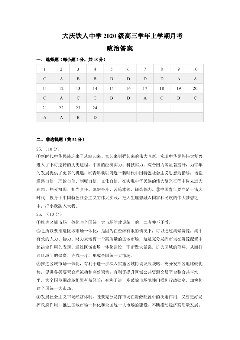 高三政治答案--黑龙江省大庆铁人中学高三上学期第一次月考