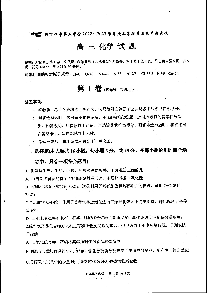 高三化学+答案--吉林省梅河口市第五中学高三上学期10月期中考试