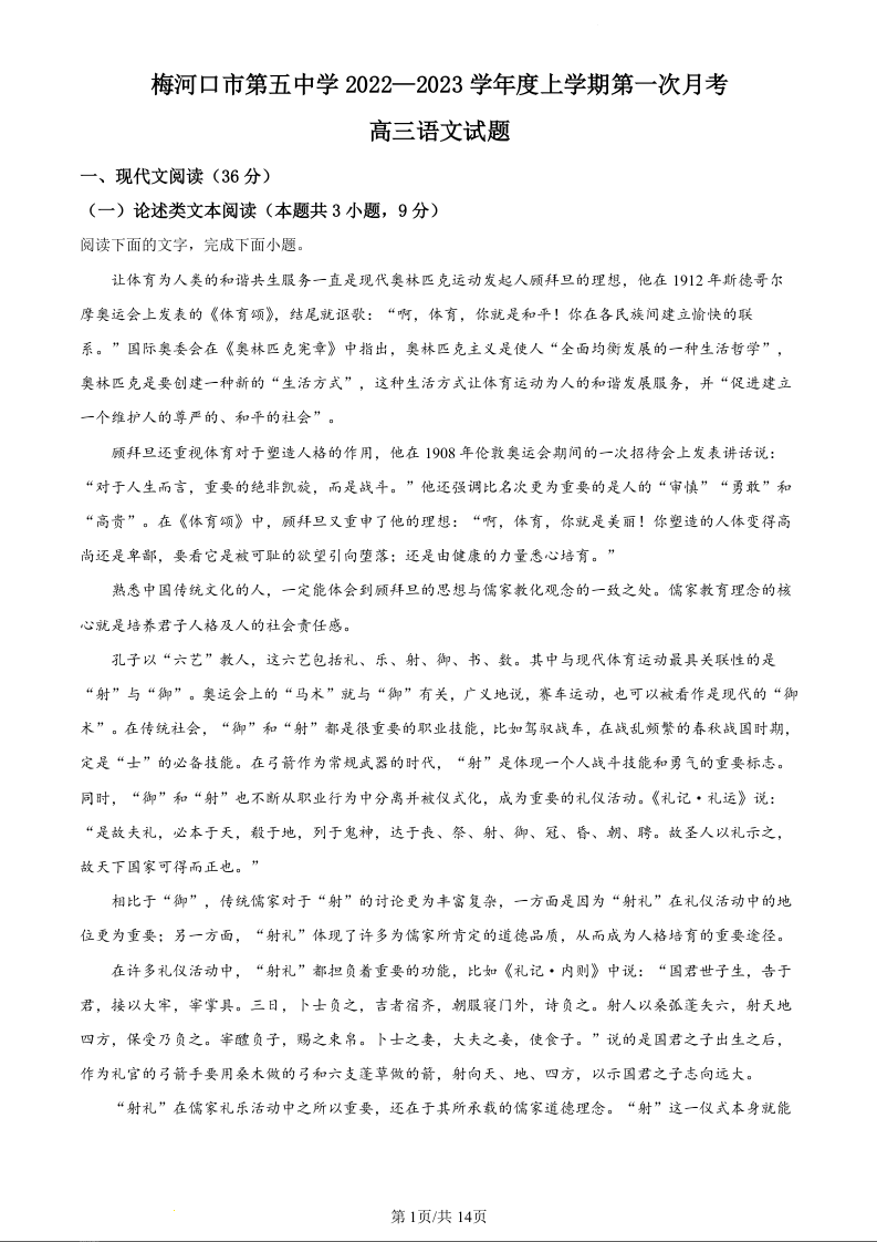 高三语文+答案--吉林省梅河口市五中2023届高三上学期第一次月考
