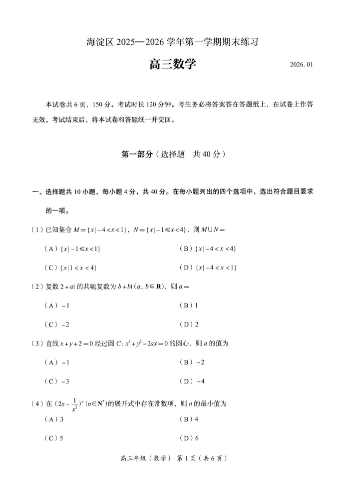 高三数学--北京市海淀区2026届高三上学期1月期末考试