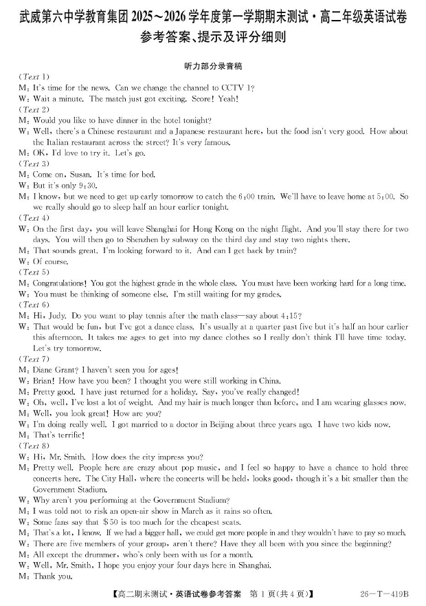 高二英语答案--甘肃省武威第六中学2025-2026学年高二上学期期末考试