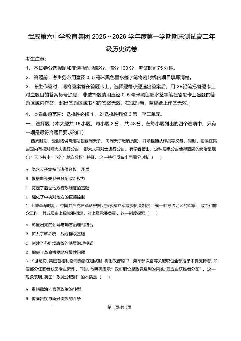 高二历史+答案--甘肃省武威第六中学2025-2026学年高二上学期期末考试